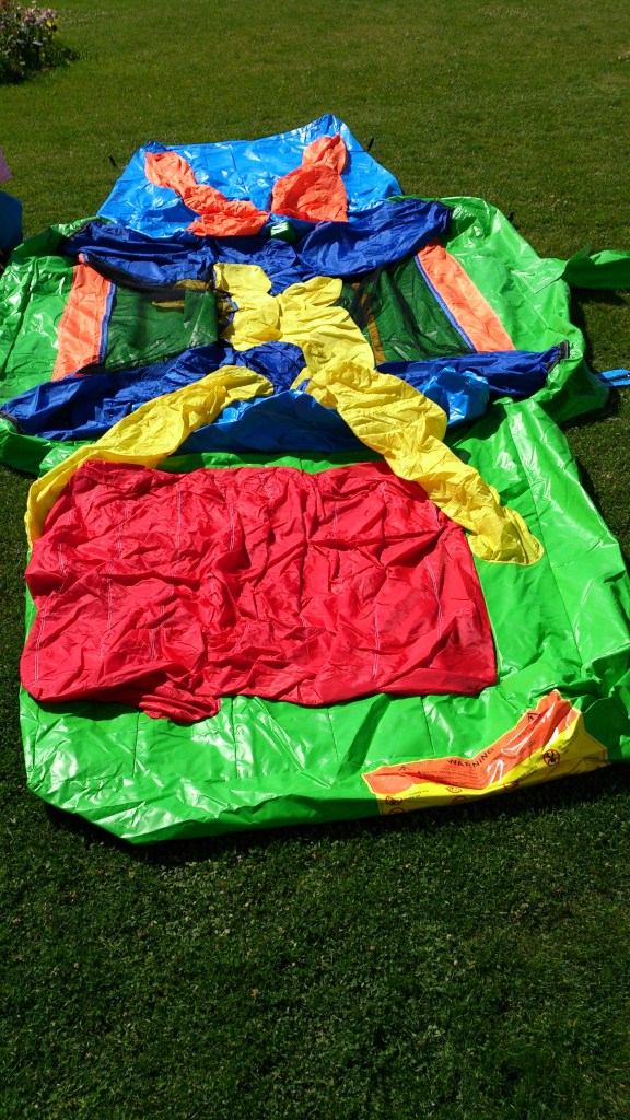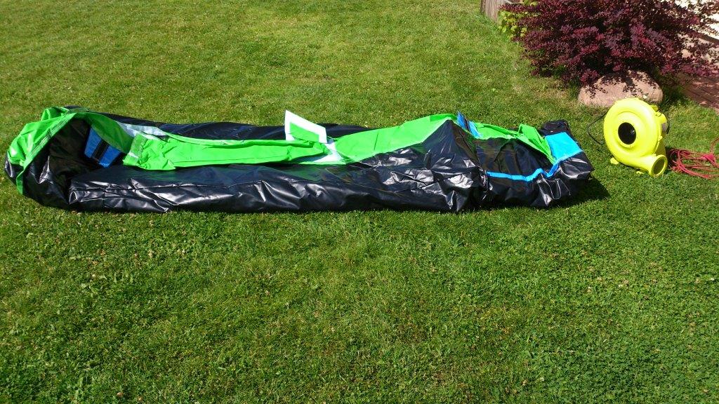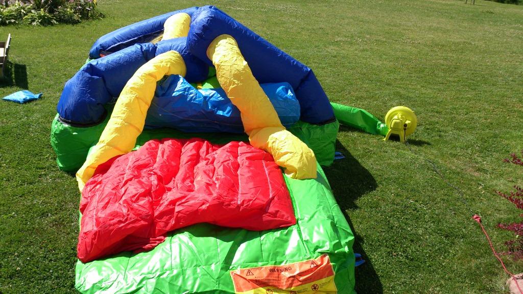4. Kui batuut on muru peal ilusti lahti laotatud, siis paigalda kompressor batuudi külge. Batuudi küljes on samast materjalist toru, mille otsas on takjapael. Pane toru ots kompressori külge.